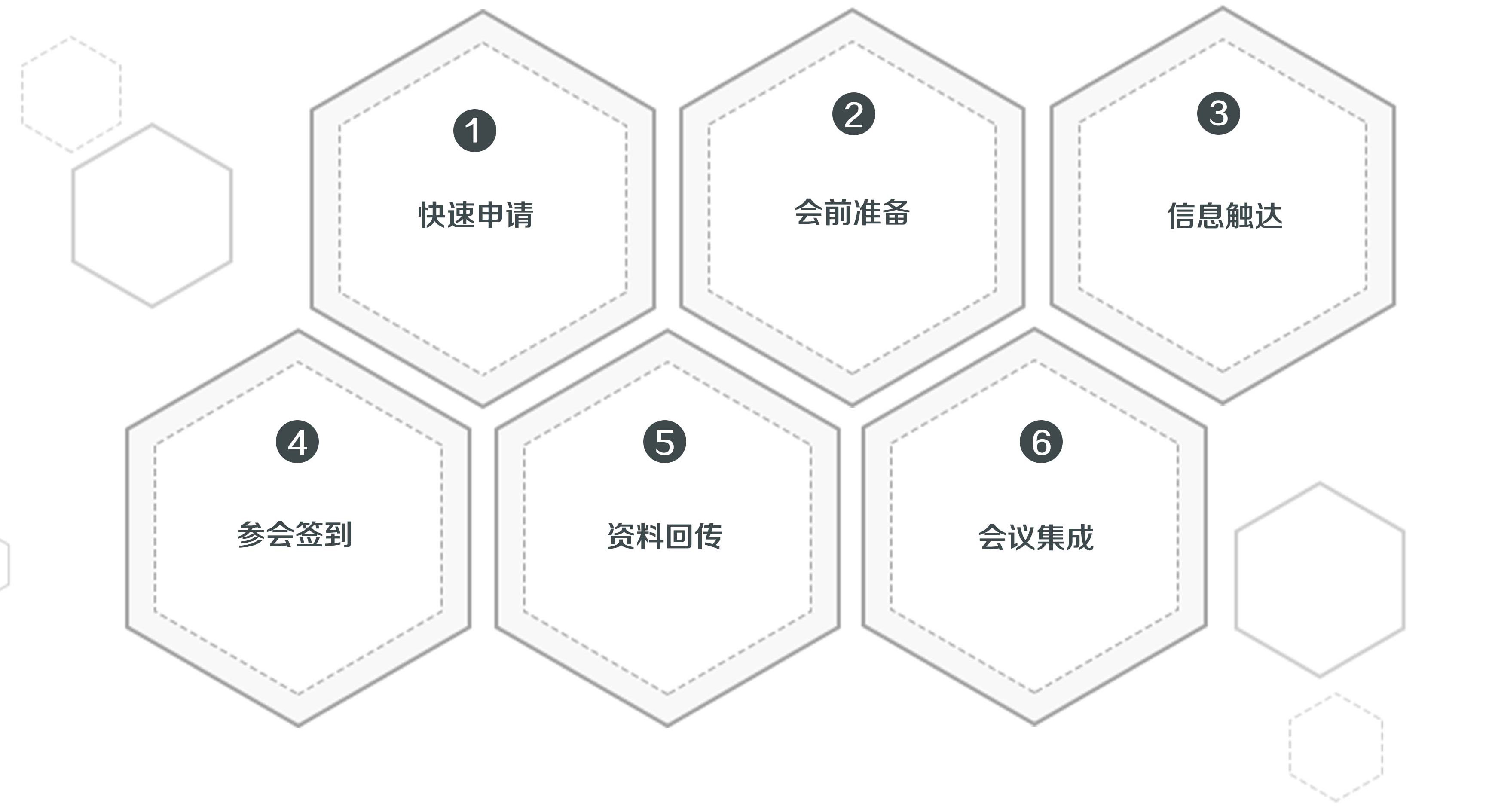 智 能 会 议 管 理 借 助 于 钉 钉 平 台 E 应 用 和 微 信 平 台 小 程 序 对 会 议 申 请 过 程 灵 活 个 性 化 管 理,主 要 特 点 是 对 会 议 物 资 和 资 料 准 备,参 会 人 员 位 置 安 排,会 议 通 知 提 醒 签 到,会 议 资 料 回 传 等 过 程 管 控。让 会 议 准 备 设 备 和 物 资 清 单 井 井 有 条。会 议 安 排 有 章 有 节,提 高 传 达 效 率。会 议 坐 次 图 一 键 生 成 一 目 了 然。会 议 提 醒 通 知 有 效 触 达。参 会 签 到 井 然 有 序。资 料 回 传 便 捷 高 效。